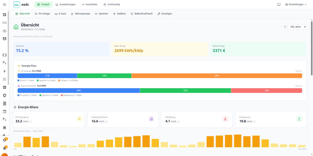 Deine PV-Anlage verdient mehr als nur einen Zählerstand. EEDC liefert dir detaillierte Analysen, Prognosen und Community-Vergleiche – standalone oder als Home Assistant Add-on.